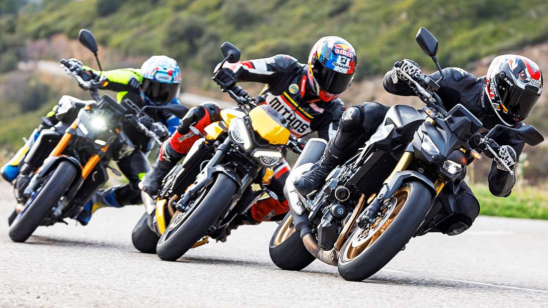 Honda CB 1000 Hornet SP, Triumph Street Triple 765 RS, Yamaha MT-09 SP: Vierzylinder-Naked Bike gegen Dreizylinder